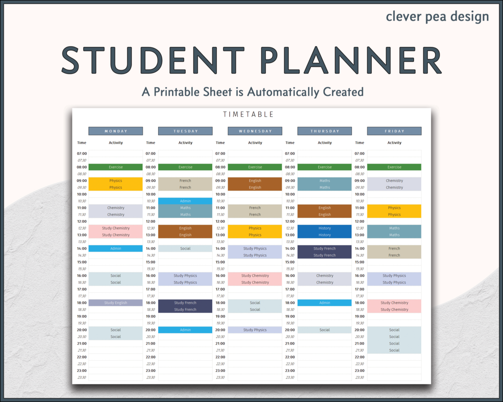 Create up to 15 activities (please contact if you need more) to assign to your classes and study times. Choose a background colour and each time you assign the category the Student Planner will format the cells in the correct colour. Changed your mind? Pick another colour and apply to the whole sheet automatically. You can also change the font colour to compliment the background colour.